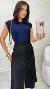 Saia Preta Feminina Midi Em Suede Com Fenda E Ziper Frontal